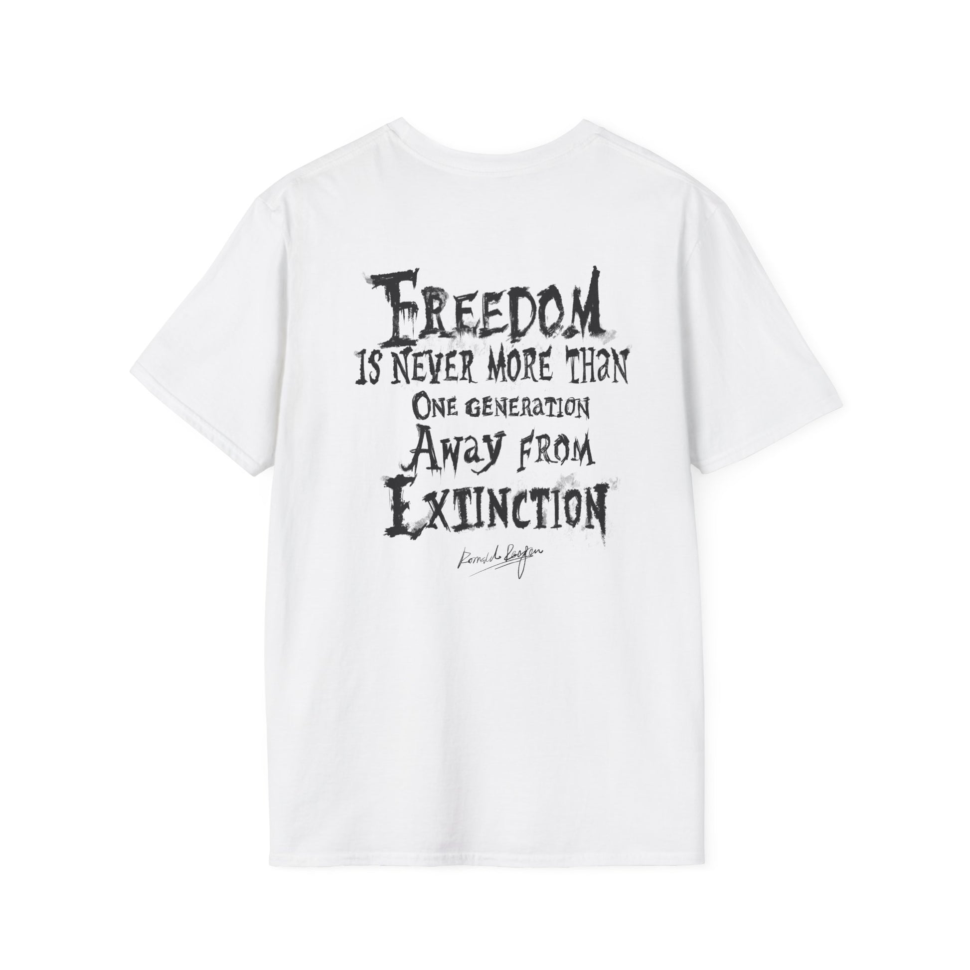 It isn't passed down in the bloodstream. It must be fought for, protected, and handed on. This design captures the urgency of Reagan's famous warning with a gritty, distressed aesthetic. A heavy message on a soft tee.